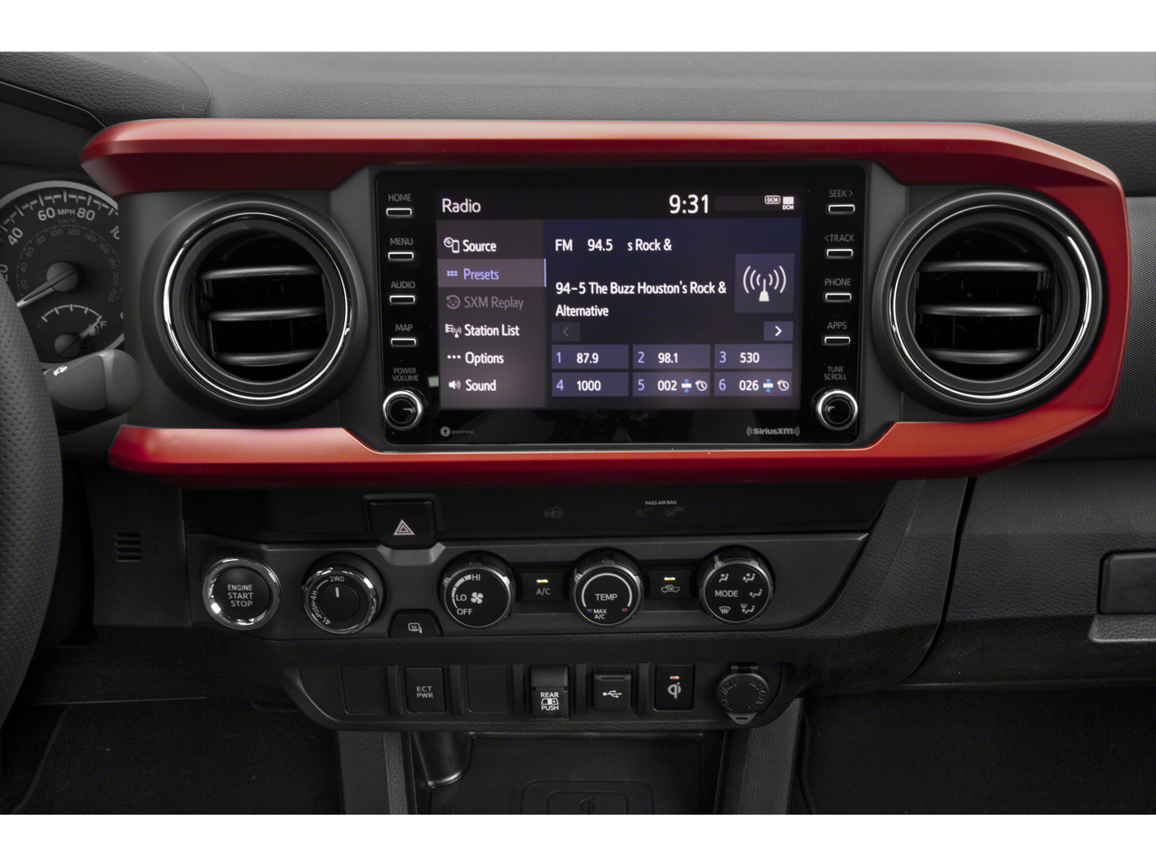 4WD, 120V/400W Deck Mounted AC Power, 6 Speakers, ABS brakes, Air Conditioning, Alloy wheels, AM/FM radio: SiriusXM, Anti-whiplash front head restraints, Apple CarPlay/Android Auto, Auto High-beam Headlights, Auto-dimming Rear-View mirror, Brake assist, Bumpers: body-color, Color-Keyed Overfenders, Driver door bin, Dual front impact airbags, Dual front side impact airbags, Electronic Stability Control, Emergency communication system: Safety Connect with 1-year trial, Engine Immobilizer, Exterior Parking Camera Rear, Fabric Seat Trim (FD), Front anti-roll bar, Front Bucket Seats, Front Center Armrest, Front fog lights, Front reading lights, Front wheel independent suspension, Heated door mirrors, Illuminated entry, Knee airbag, Leather Shift Knob, Low tire pressure warning, Occupant sensing airbag, Outside temperature display, Overhead airbag, Overhead console, Panic alarm, Passenger door bin, Power door mirrors, Power driver seat, Power Sliding Rear Window w/Privacy Glass, Power steering, Power windows, Radio: AM/FM/HD Radio, Rear step bumper, Remote keyless entry, Security system, Speed control, Speed-sensing steering, Split folding rear seat, Steering wheel mounted audio controls, Tachometer, Telescoping steering wheel, Tilt steering wheel, Traction control, Trip computer, Turn signal indicator mirrors, Variably intermittent wipers, and Wheels: 17 x 7.5J Machined Alloy.